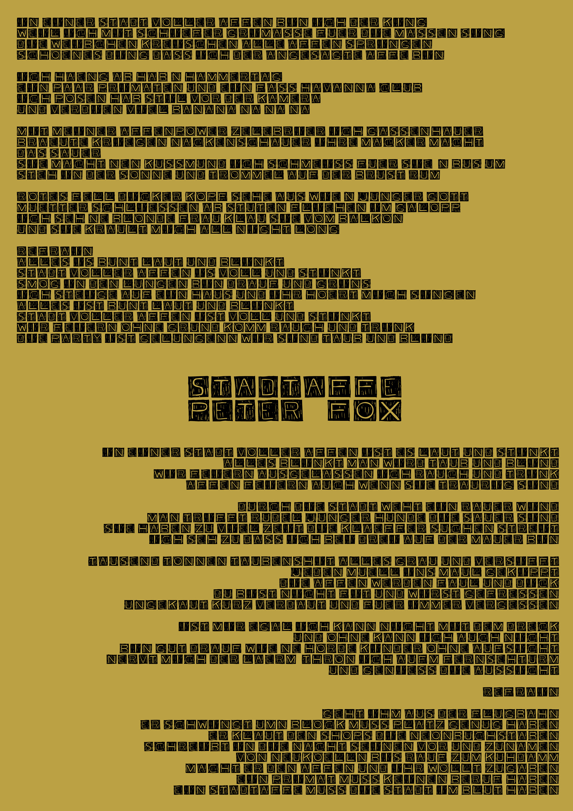 Der Songtext von Peter Fox "Stadtaffe" wurde auf dem A3 Format von mir nach verschiedenen Kriterien gestaltet. Am Ende sollten die vier Blätter zusammen passen. Ich wählte und setzte die Typografie, zeichnete die Illustrationen und gestaltete die Bögen. Außerdem wählte ich ein goldenes etwas stärkeres Papier und bedruckte dieses dann, wie Sie es im Folgenden sehen.